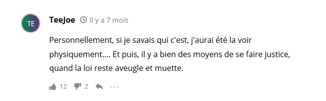 En effet, elle appelle des réactions comme celle qui suit, parfaitement bien acceptée par la modération du site, qui par ailleurs refuse catégoriquement tout commentaire contredisant quelque peu les contenus de cet « article », en sachant pourtant pertinemment qu’ils sont entièrement faux, mensongers, calomnieux à mon égard, et que j’y suis de plus très facilement identifiable :