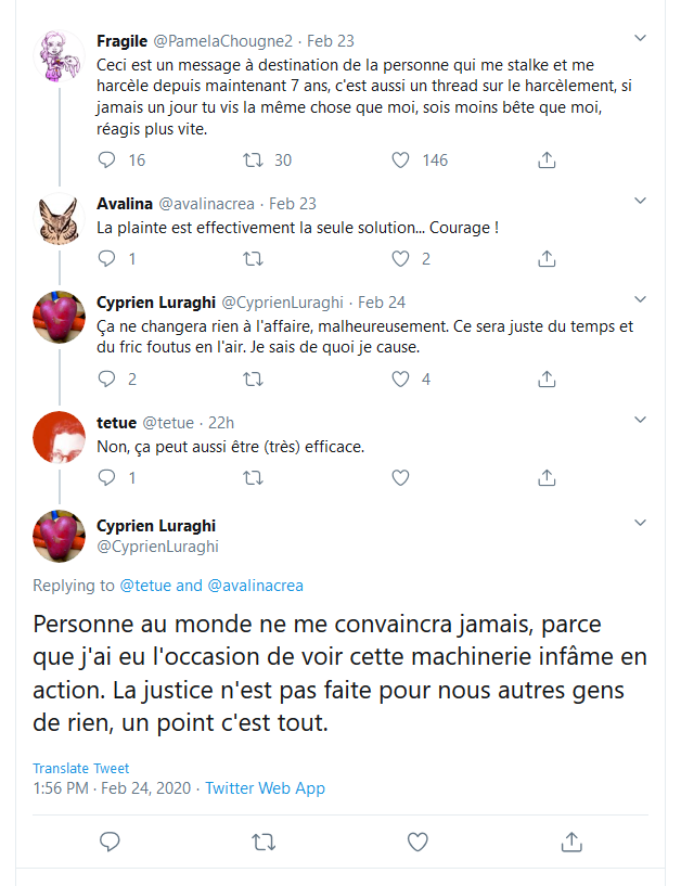 Pour commencer, la policière de Brest qui m’avait interrogée le 15 février 2011 à la suite de mes premières plaintes avait refusé de joindre à ma déposition les éléments de preuve que je lui présentais, arguant que son collègue de Puy-l’Evêque irait de toute façon les rechercher sur les blogs du cybercriminel. Mais le gendarme en question n’a en définitive jamais consulté que les articles de l’unique blog public du délinquant, alors que l’essentiel de ses textes publics me concernant se trouvait dans les commentaires sur ces articles, et que les plus sensibles de ses textes me concernant étaient tous supportés par un autre blog m’étant celui-là exclusivement dédié, son blog Tique Toc ouvert en juin 2010 et devenu entièrement privé fin août 2010. S’abstenant d’interroger le mythomane Pascal Edouard Cyprien Luraghi sur tous les commentaires de son blog public me concernant, il l’avait cru sur parole à propos de l’intégralité des contenus du second blog, Tique Toc, qui depuis sa fermeture au public ne supportait plus que des discussions de comploteurs à mon encontre. L’auteur de toutes les horreurs publiques de l’été 2010 sur ce blog Tique Toc (injures, diffamations et atteintes à l’intimité de la vie privée à profusion additionnées de menaces diverses, de harcèlement moral et d’un harcèlement sexuel évident), et de toutes les discussions privées qui désormais trahissaient bien d’autres infractions pénales à mon encontre, lui avait en effet déclaré tout ce blog très « propre » et ne contenant aucune « saloperie »…