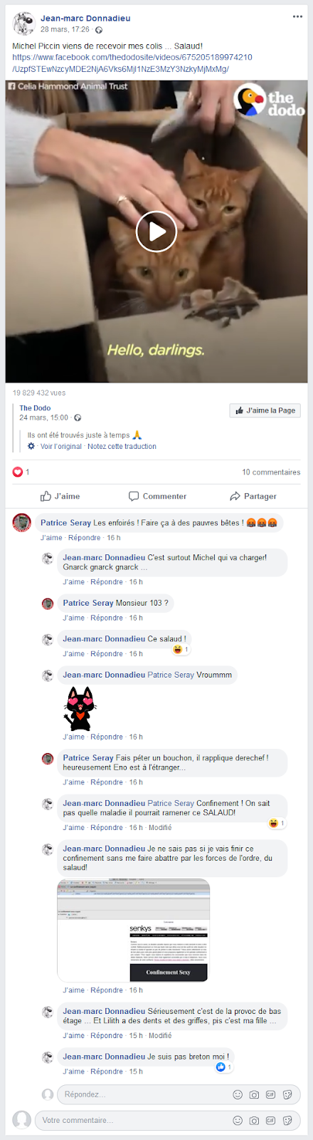 Son grand ami et complice Patrice Seray, qui lui obéit toujours au doigt et à l’oeil, lui, s’est déjà rendu à la gendarmerie pour faire ses déclarations mensongères à mon encontre il y a quelques temps. Il a commencé à s’en mordre les doigts le 10 février dernier, et cela va continuer…