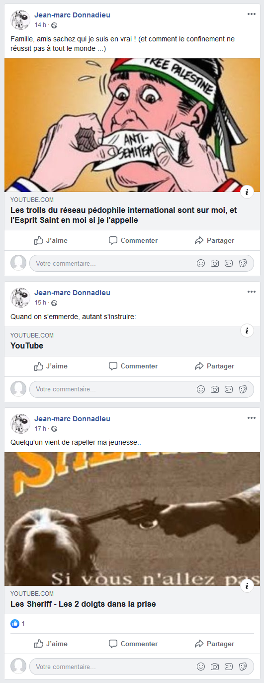 D’une part, Jean-Marc Donnadieu qui n’a rien posté sur sa page Facebook depuis hier a aussi cessé d’inonder mon blog Satanistique de ses commentaires tous injurieux à mon égard. Mieux encore : à la suite de ma première publication d’hier, il a brutalement cessé de faire de l’humour à sa manière sur Facebook pour n’y poster que sérieusement sur le coronavirus et s’est abstenu de toute nouvelle communication aujourd’hui.